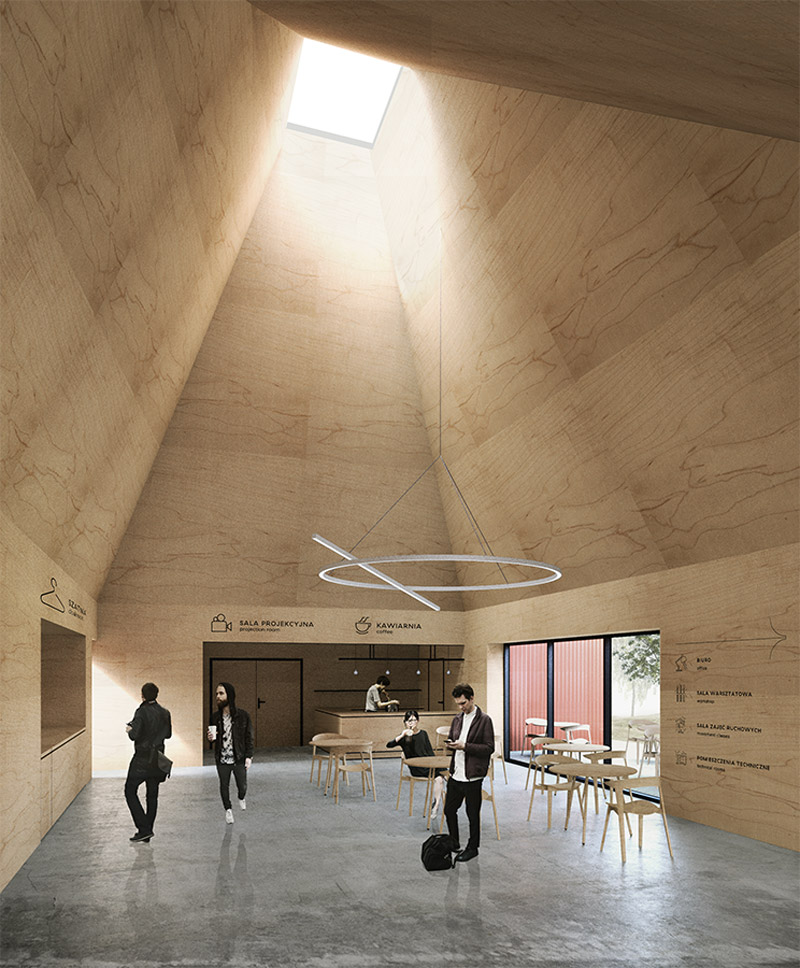 Koncepcja konkursowa studia 89 stopni to dom lokalnej społeczności będący malarskim uzupełnieniem otaczającego go ogrodu. Obiekt został rozbity na mniejsze moduły nawiązujące skalą i formą do historycznego układu domów w Komorowie. Bryła budynku meandruje między koronami drzew wyznaczając w swoim obrysie place – podwórka o różnych charakterach będące uzupełnieniem funkcji wewnątrz.