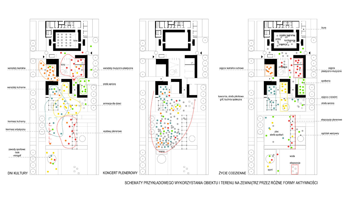Teren konkursowy wokół Domu Kultury zaprojektowano jako wielofunkcyjną otwartą przestrzeń sprzyjającą różnym formom aktywności plenerowej. Obszar podzielono na tematyczne strefy przylegające do siebie i przenikające się wzajemnie. Mieszkańcy Osiedla Nowe Żerniki znajdą tutaj miejsce do wspólnych spotkań, spędzenia czasu na koncercie, obejrzenia wystawy plenerowej, pracy twórczej na świeżym powietrzu lub wspólnego grillowania wraz z rodziną.