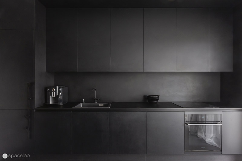 Inwestorskie „must have”, które miała uwzględnić architektka to czarna kuchnia oraz sofa w odcieniu butelkowej zieleni. Spełniając te prośby zaproponowała jednocześnie by salon został ujęty w ramy dwóch czarnych ścian – po przeciwległej stronie kuchni stanęła druga ciemna ściana, tym razem o fakturowanej strukturze rozpraszającej światło.