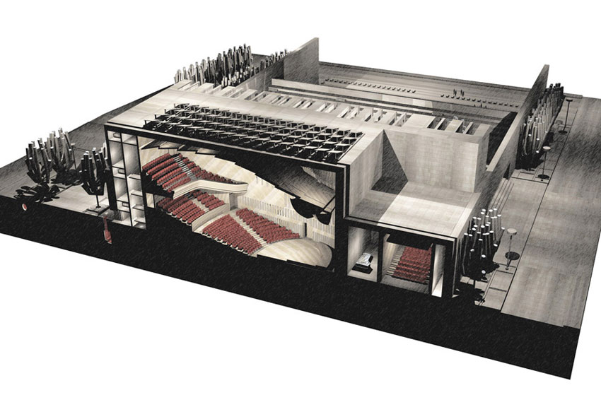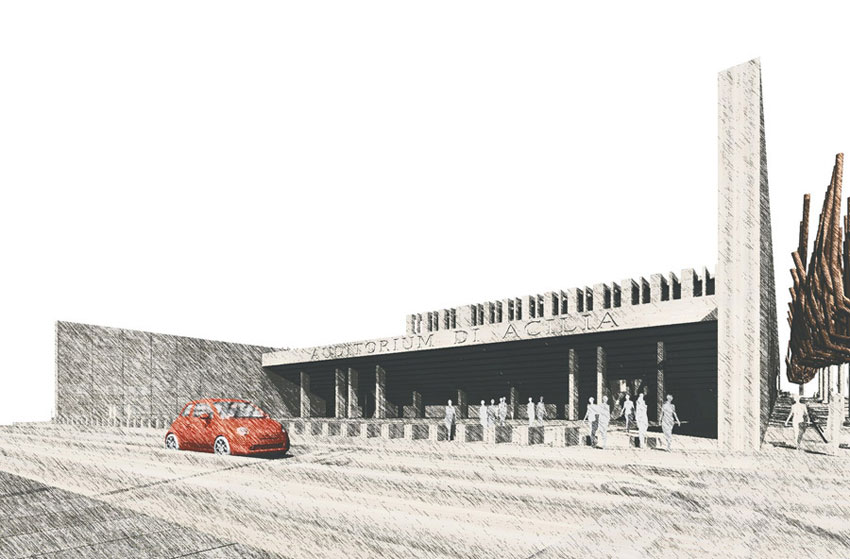 Budynek audytorium powstaje w ramach programu rewitalizacji peryferyjnych dzielnic Rzymu. Struktura budynku podporządkowana jest ortogonalnej siatce ulic i uzupełnia kwartałową zabudowę dzielnicy. Podstawowe elementy funkcjonalne audytorium to: wewnętrzny plac – agora z amfiteatrem, monumentalne, wielofunkcyjne foyer, główna sala audytorium na 700 miejsc oraz sala kameralna na 100 miejsc.