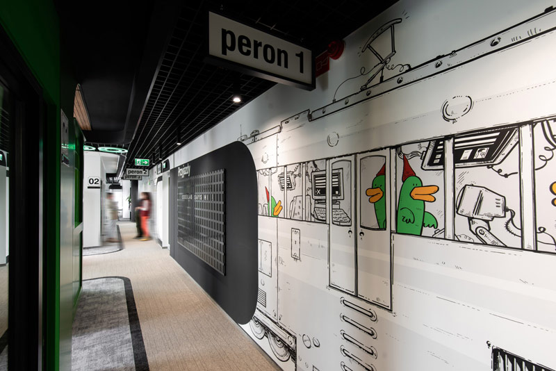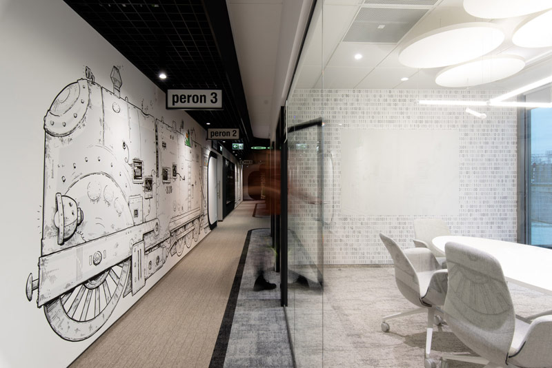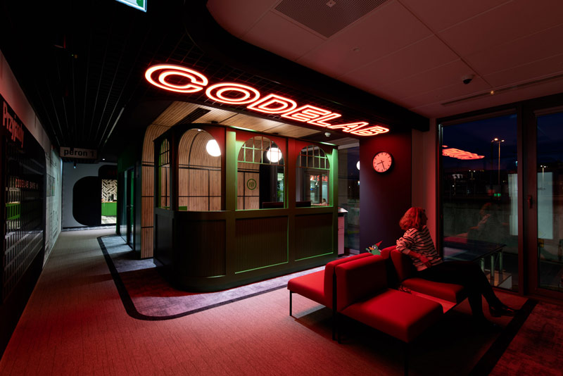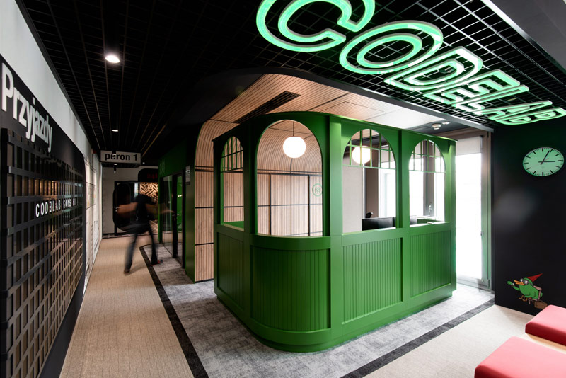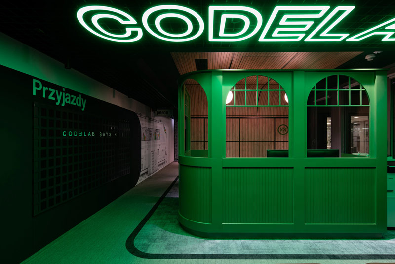 Bezpośrednie sąsiedztwo biura z dworcem Wrocław Główny stało się inspiracją do „zaproszenia” tej przestrzeni do biur CodeLab. Strefa wejściowa pełna jest odniesień do zabytkowych wnętrz budynku dworca takich jak listwowe sufity i okienka kas biletowych, a drogę w biurze wskazują stylizowane oznaczenia peronów. W jednej z salek konferencyjnych — wagonie, można poczuć zew podróży, gdy z rastrowego sufitu neonowy CodeLab puszcza oko do świecącego w ciemności Wrocławia Głównego.