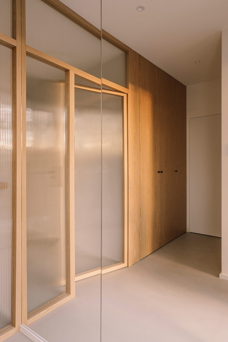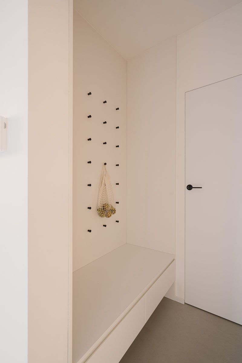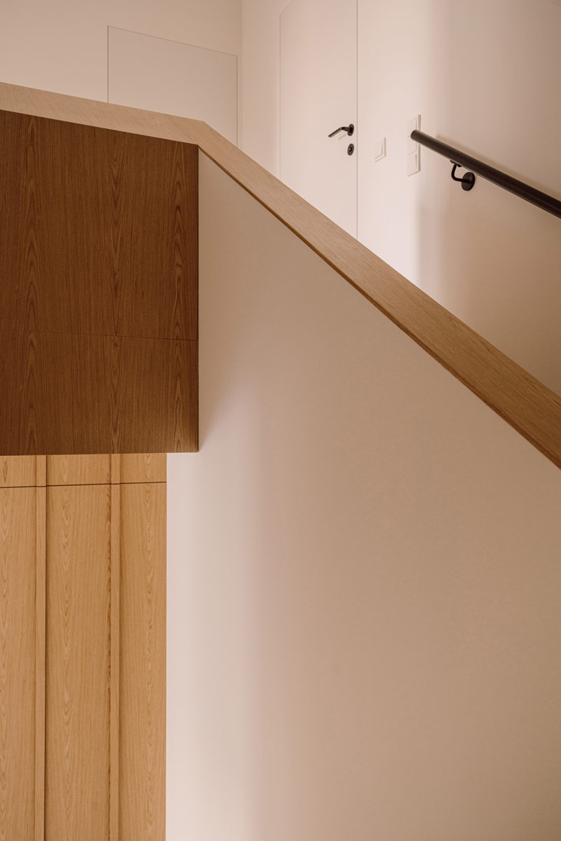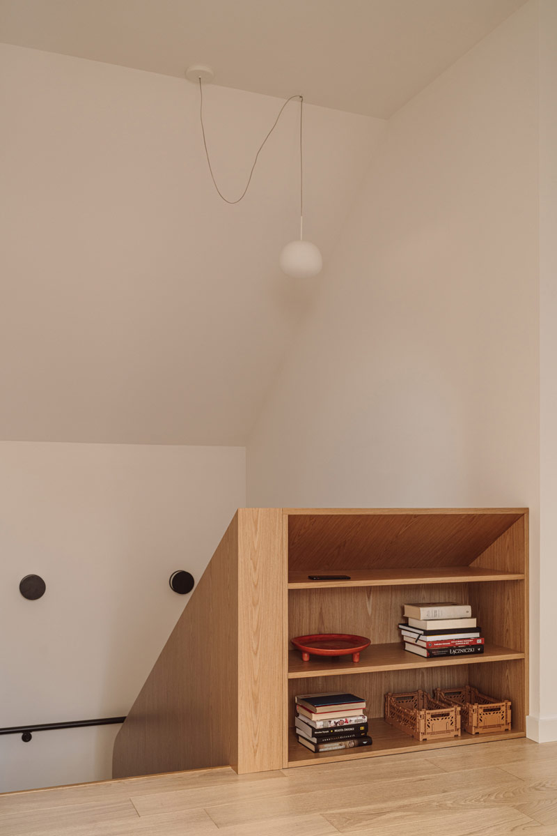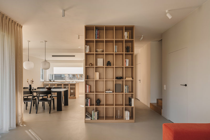 W domu wydzielono funkcjonalne przestrzenie, które umożliwiają swobodne poruszanie się i codzienne funkcjonowanie całej rodziny oraz sprytnie ukryto przejścia do pomieszczeń gospodarczych i wszelkiego rodzaju schowki. Hol oddzielony został od reszty domu szklanymi, ryflowanymi drzwiami. Szkło ornamentowe użyte do wypełnienia ram drzwiowych wpuszcza światło do pomieszczenia, jednocześnie przysłaniając niechciane widoki. W pomieszczeniu wejściowym znalazła się szafa garderobiana i ściana z wieszakami równomiernie rozlokowanymi na plecach zabudowy. Pomieszczenie ma też bezpośrednie przejście do pralni i garażu. Otwartą strefę dzienną oddziela od klatki schodowej zabudowa meblowa w formie kubika, w której ukryto szafy gospodarcze, dodatkowe przechowywanie służące kuchni oraz funkcjonalny regał.