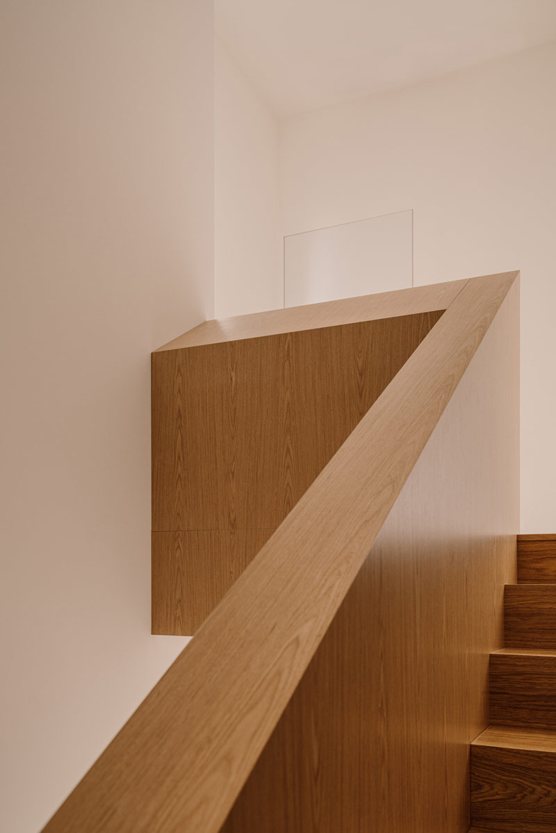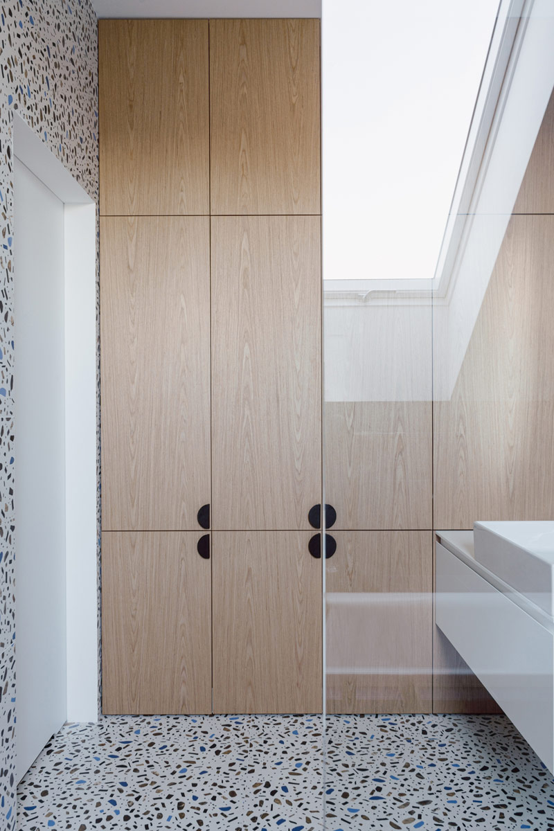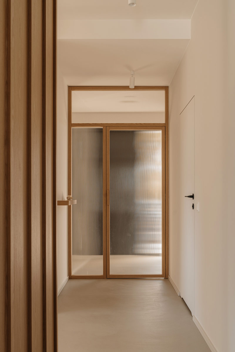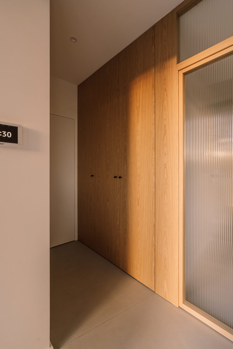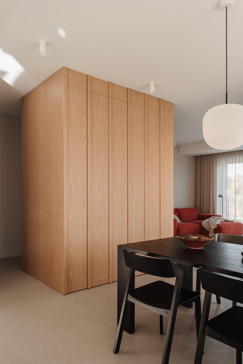 W domu wydzielono funkcjonalne przestrzenie, które umożliwiają swobodne poruszanie się i codzienne funkcjonowanie całej rodziny oraz sprytnie ukryto przejścia do pomieszczeń gospodarczych i wszelkiego rodzaju schowki. Hol oddzielony został od reszty domu szklanymi, ryflowanymi drzwiami. Szkło ornamentowe użyte do wypełnienia ram drzwiowych wpuszcza światło do pomieszczenia, jednocześnie przysłaniając niechciane widoki. W pomieszczeniu wejściowym znalazła się szafa garderobiana i ściana z wieszakami równomiernie rozlokowanymi na plecach zabudowy. Pomieszczenie ma też bezpośrednie przejście do pralni i garażu. Otwartą strefę dzienną oddziela od klatki schodowej zabudowa meblowa w formie kubika, w której ukryto szafy gospodarcze, dodatkowe przechowywanie służące kuchni oraz funkcjonalny regał.