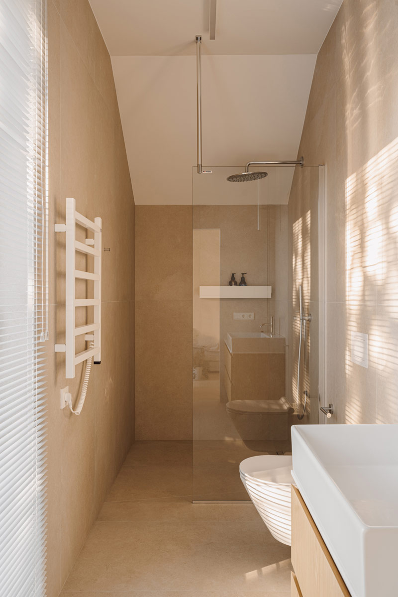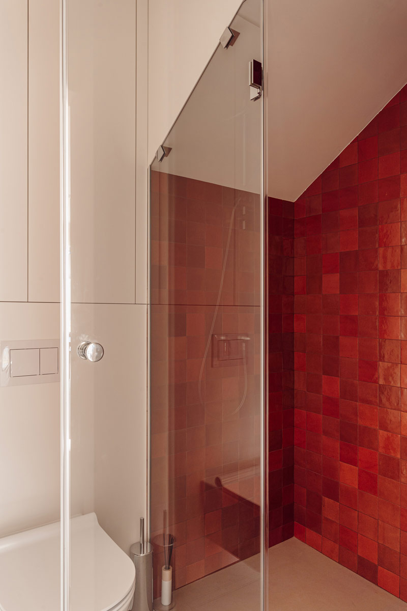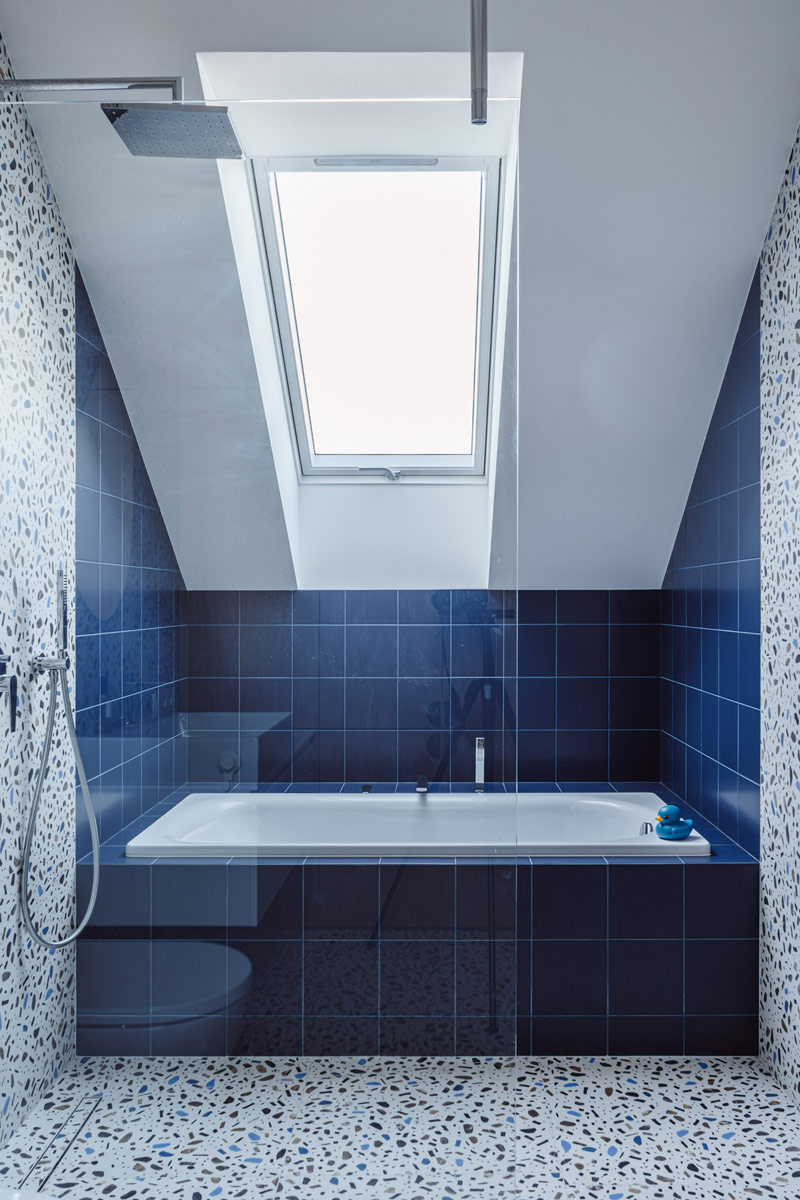 Na wyższej kondygnacji znajduje się minimalistyczna, przytulna sypialnia oraz łazienka z prysznicem walk-in, wykonana w jasnych, monochromatycznych barwach. Jako płytkę bazową użyto tutaj gresu z wzorem kamiennym. Łazienka dzieci jest zupełnie różna od tej przy sypialni, pełna energii, z mocnym wzorem gresu Fioranese połączonym z jednolitą, kobaltową płytką. Wspólnym mianownikiem jest obecność naturalnego dębu, który łączy te przestrzenie. Sypialnie dzieci zostały zaaranżowane we własnym zakresie Inwestorów, tak aby odpowiadały zmieniającym się potrzebom ich pociech.