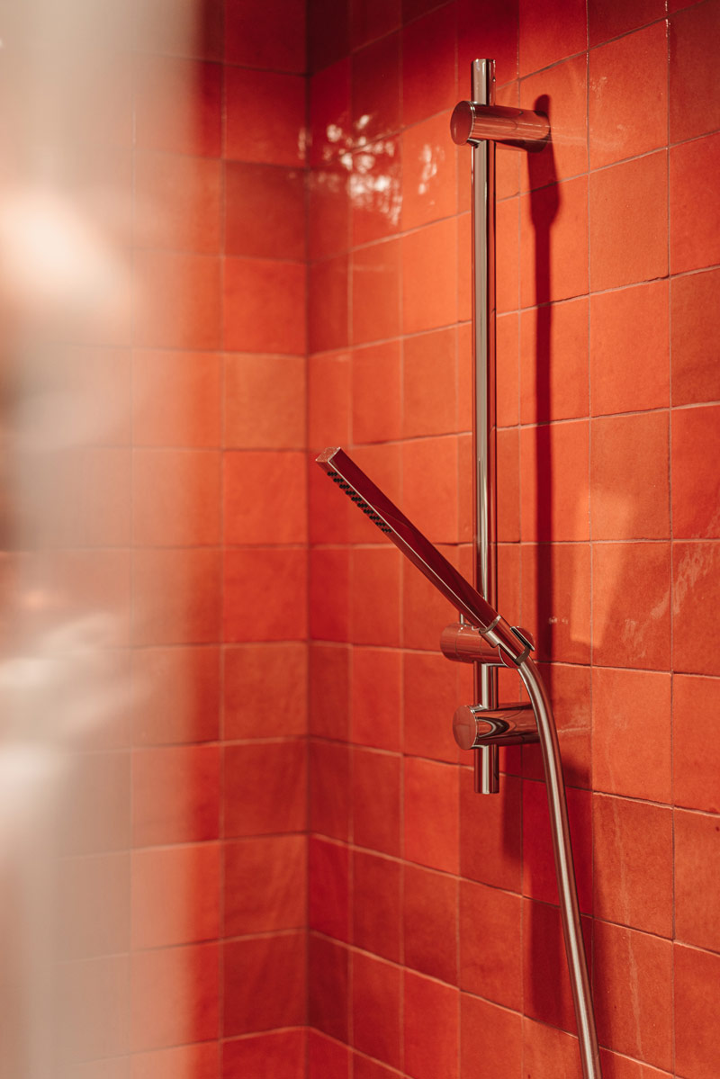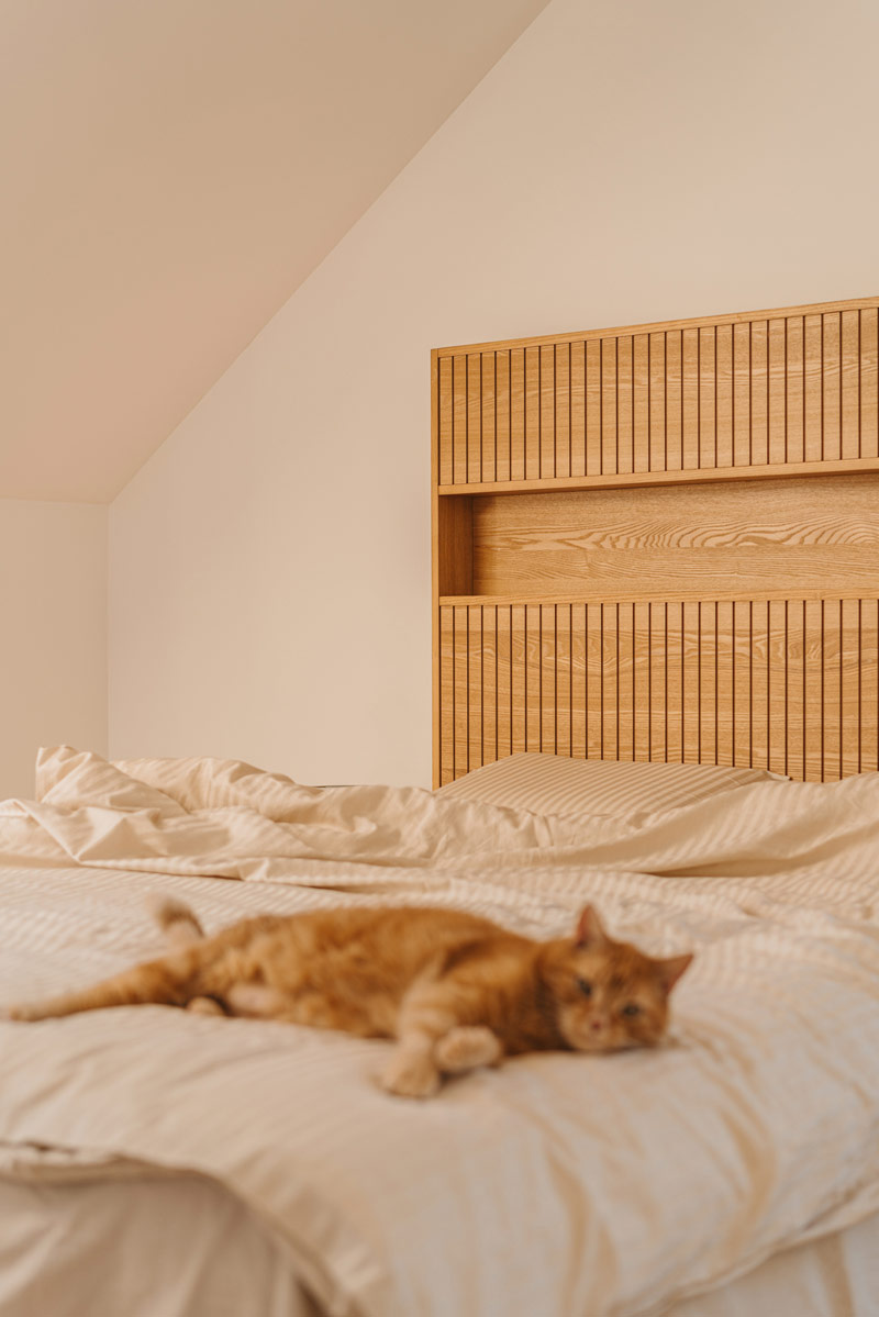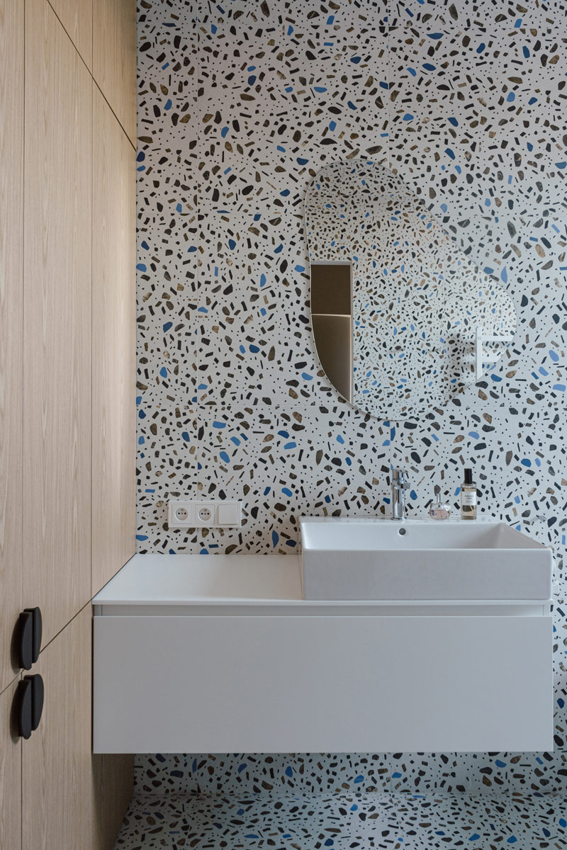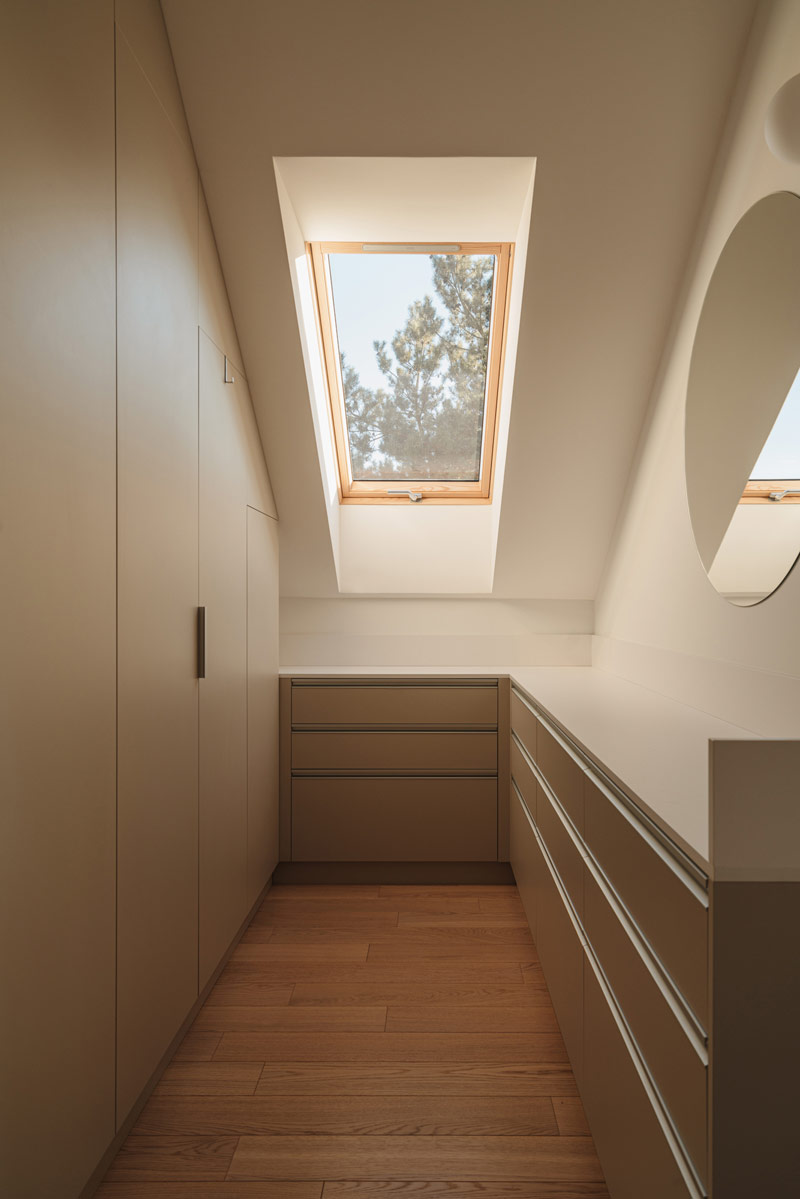 Na wyższej kondygnacji znajduje się minimalistyczna, przytulna sypialnia oraz łazienka z prysznicem walk-in, wykonana w jasnych, monochromatycznych barwach. Jako płytkę bazową użyto tutaj gresu z wzorem kamiennym. Łazienka dzieci jest zupełnie różna od tej przy sypialni, pełna energii, z mocnym wzorem gresu Fioranese połączonym z jednolitą, kobaltową płytką. Wspólnym mianownikiem jest obecność naturalnego dębu, który łączy te przestrzenie. Sypialnie dzieci zostały zaaranżowane we własnym zakresie Inwestorów, tak aby odpowiadały zmieniającym się potrzebom ich pociech.