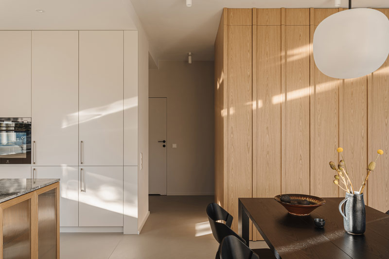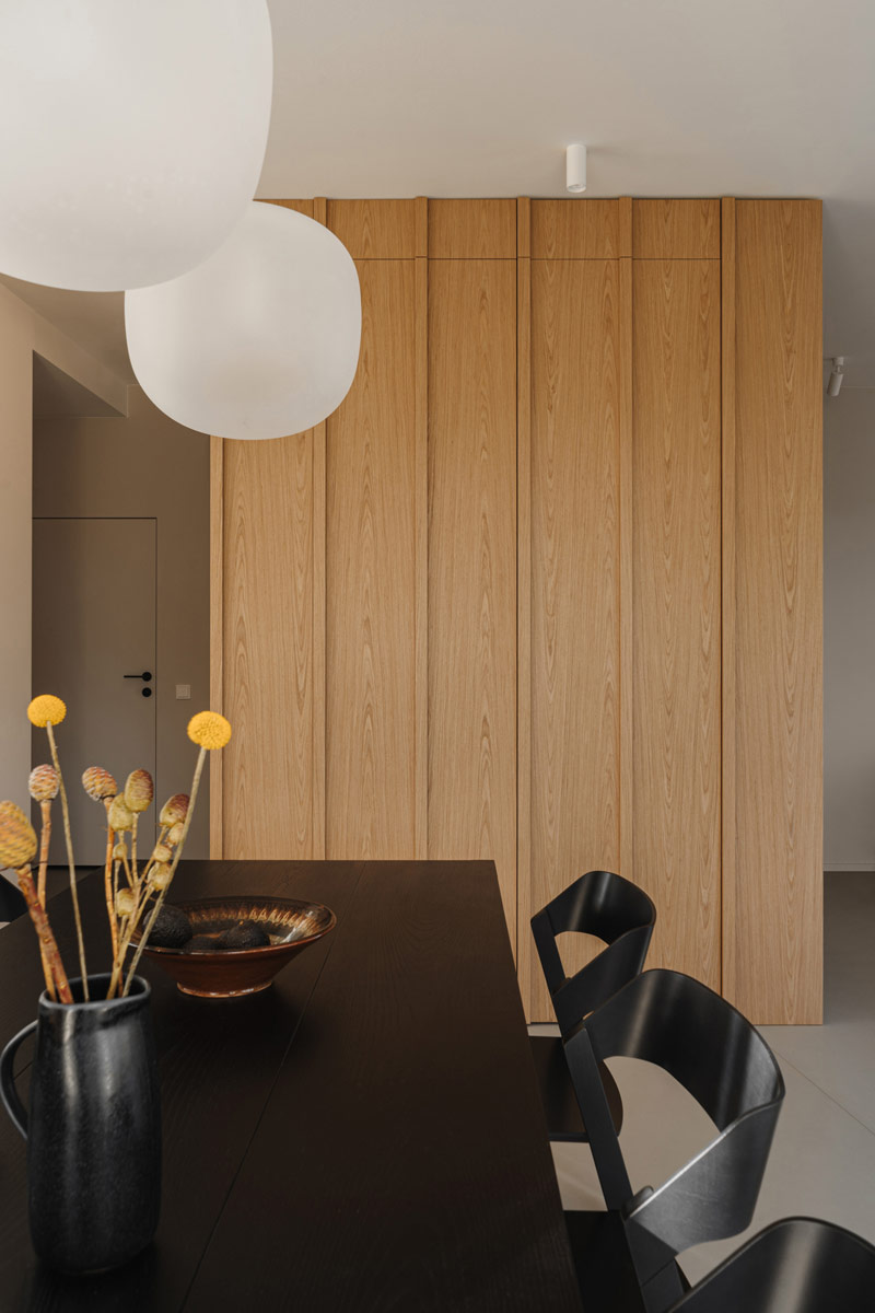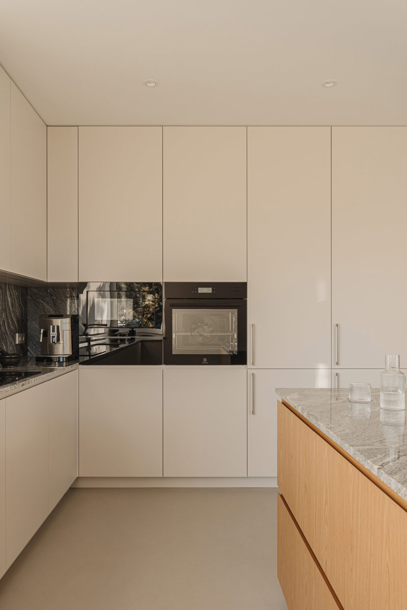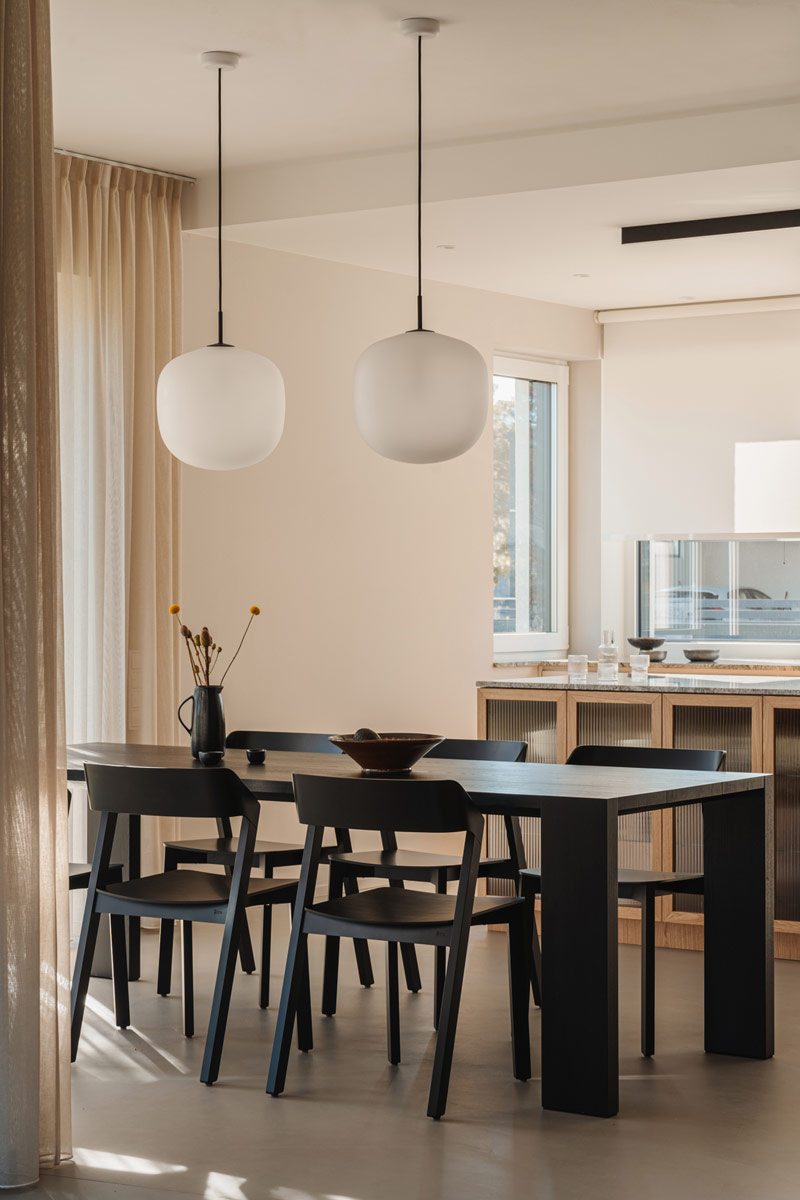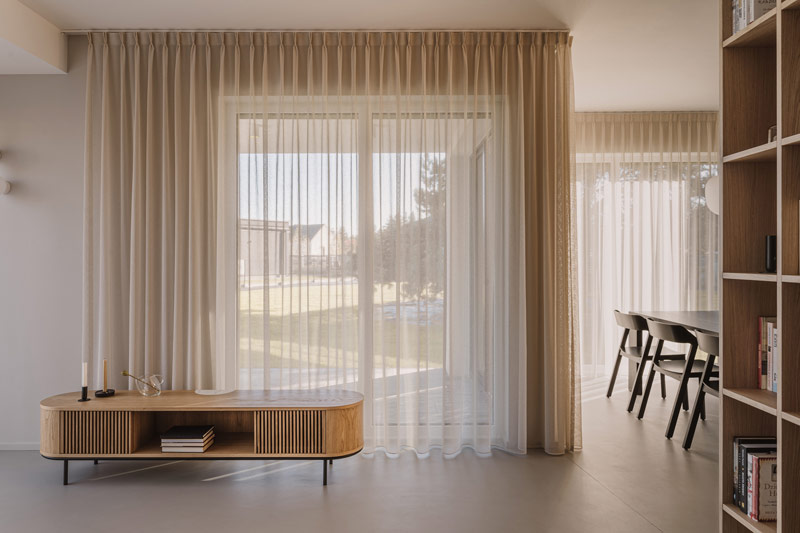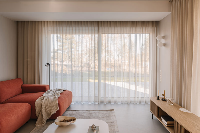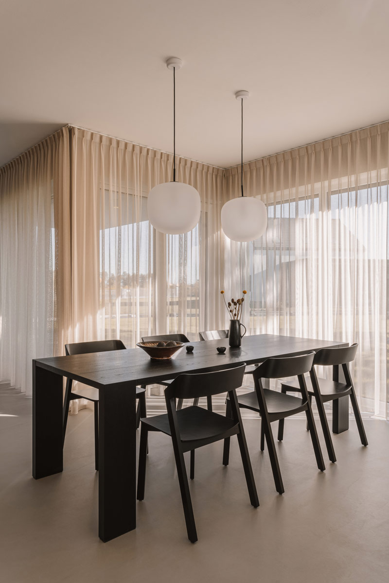 Już w założeniach projektowych Inwestorzy określili preferowane materiały i kolorystykę wnętrz. Baza projektu jest ponadczasowa tak aby była odporna na naturę przemijania. Posadzka z mikrobetonu w ciepłym szaro-beżowym odcieniu uzupełniona została o elementy z naturalnego jasnego dębu. Dopełnieniem są beże, szarości, biele, a także kamień granitowy, który tworzy widoczny naturalny detal. Kontrastem natomiast są elementy z czarnego drewna oraz odważne plamy kolorystyczne pojawiające się w projekcie. Całości dopełniają dekoracje okienne z ponadczasowymi upięciami. Na firany wykorzystano tkaninę o lnianym splocie w jasno beżowym wybarwieniu.