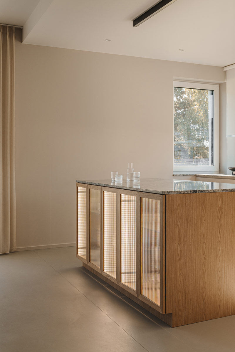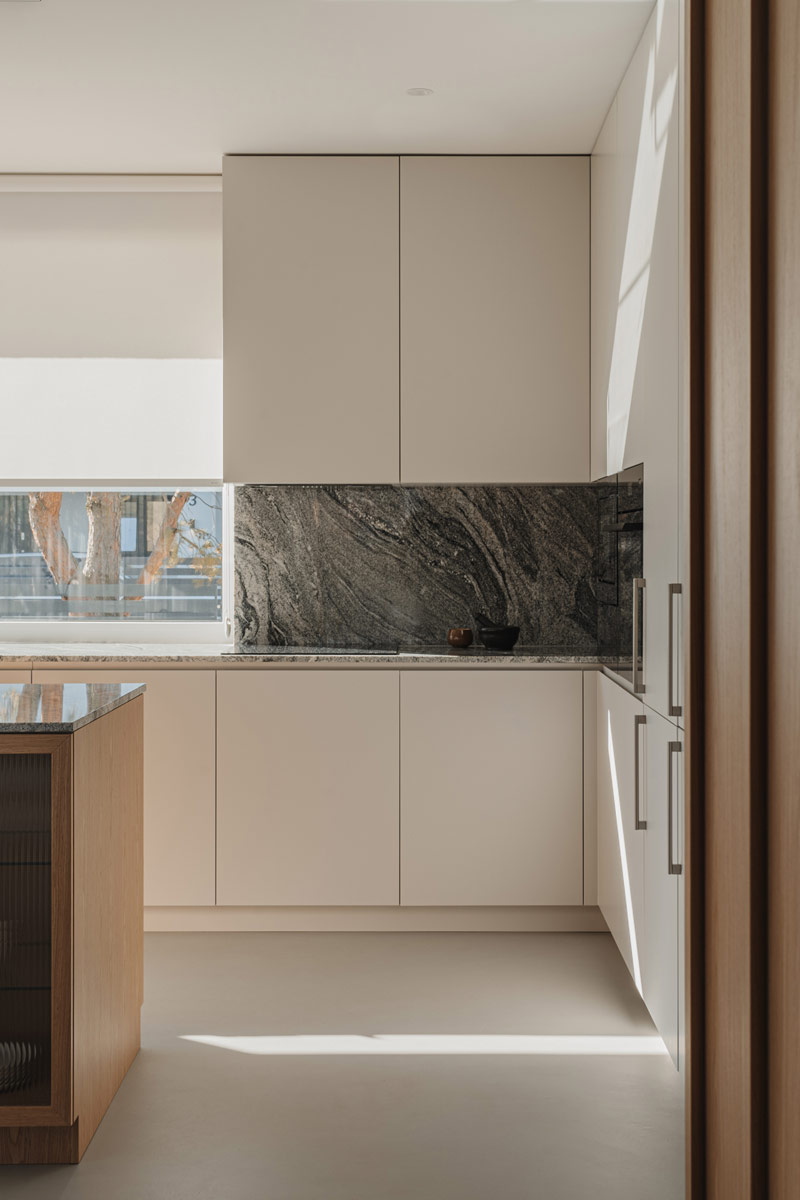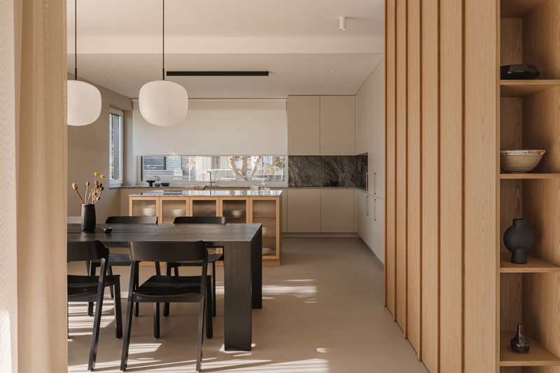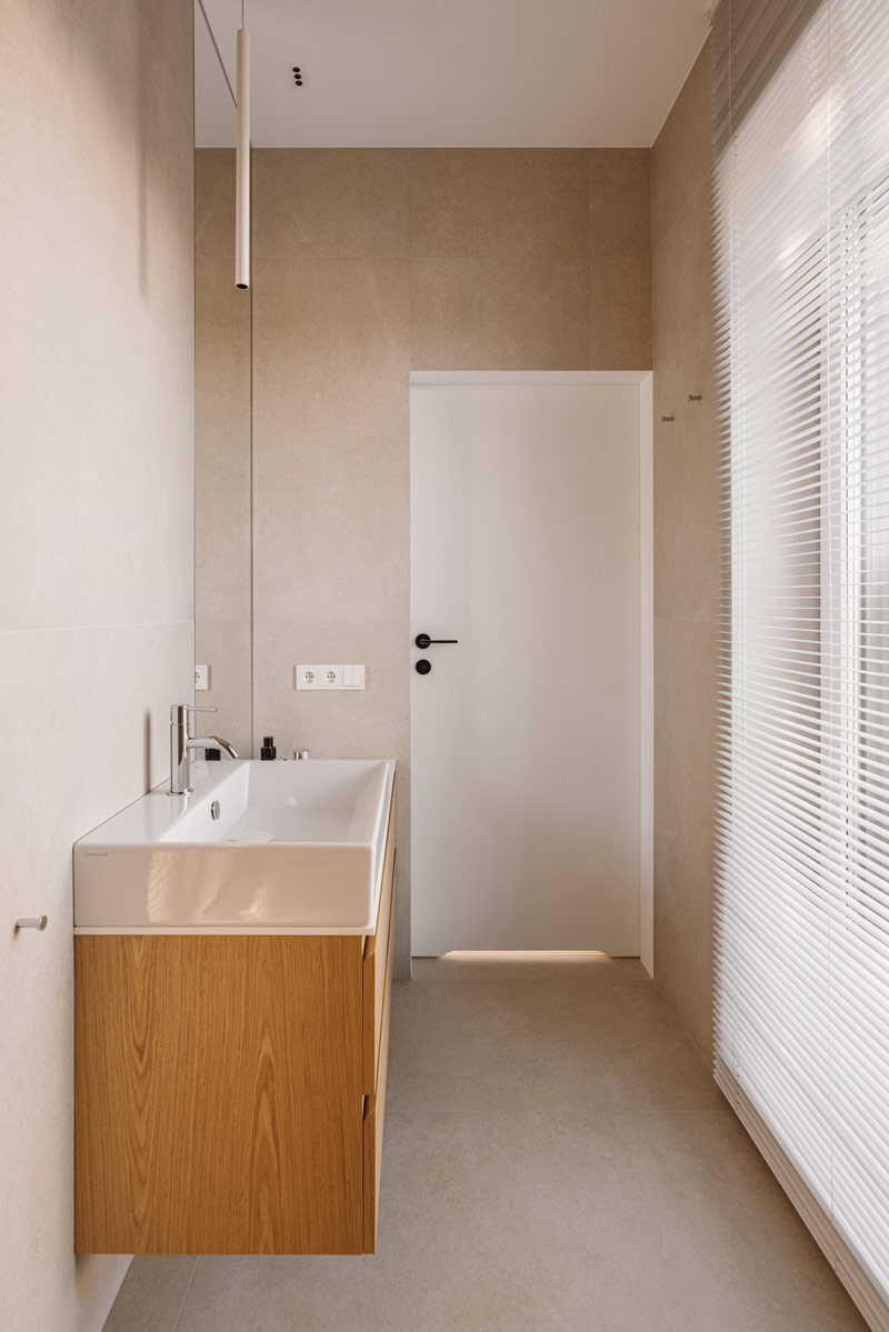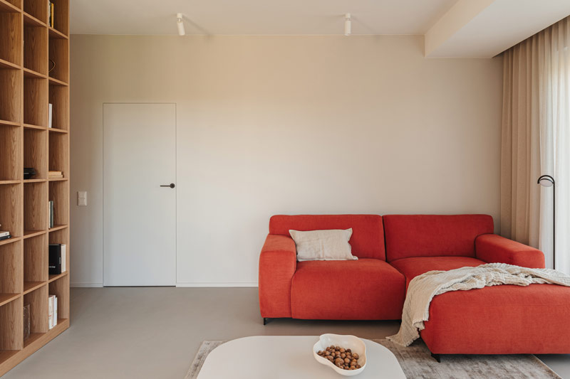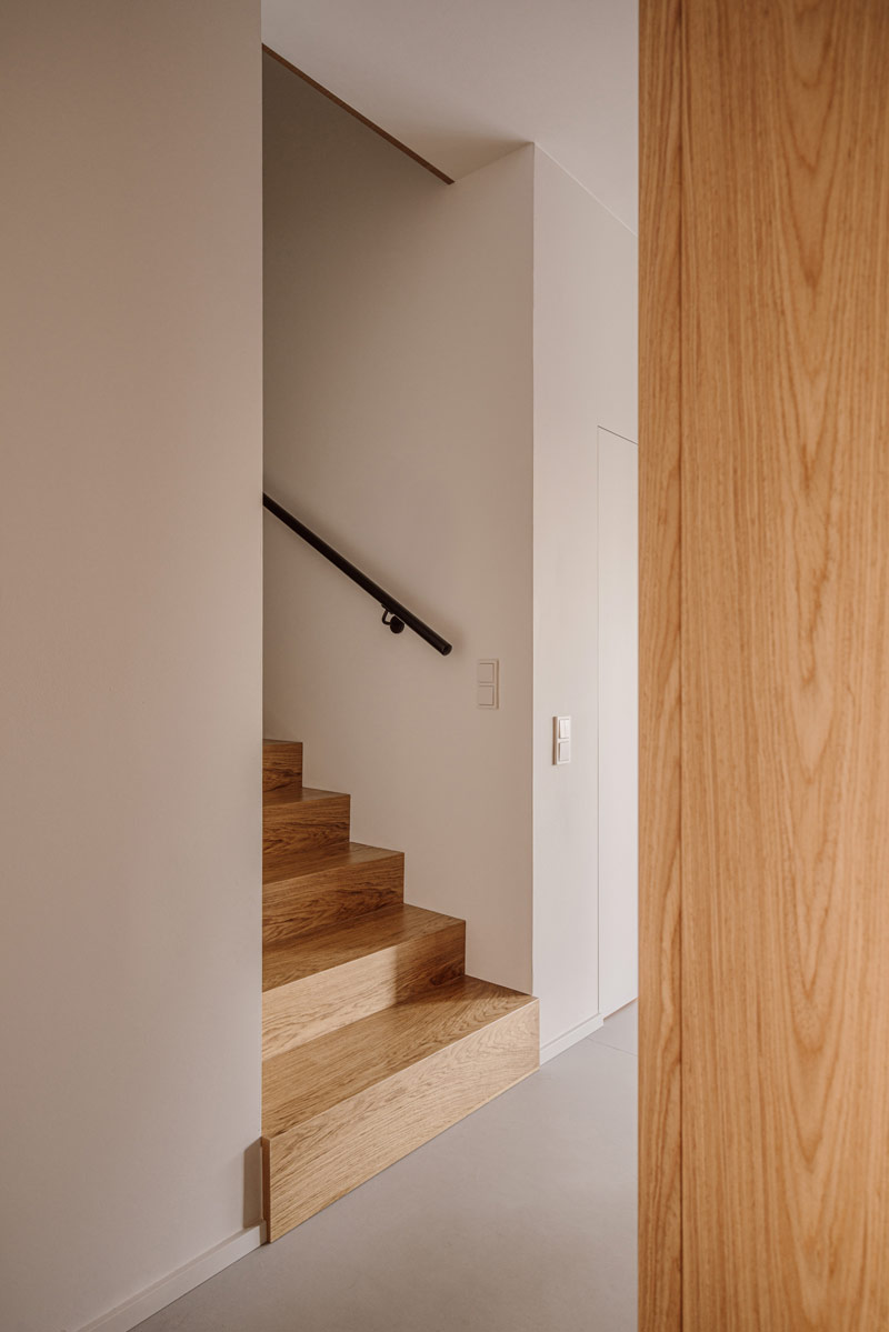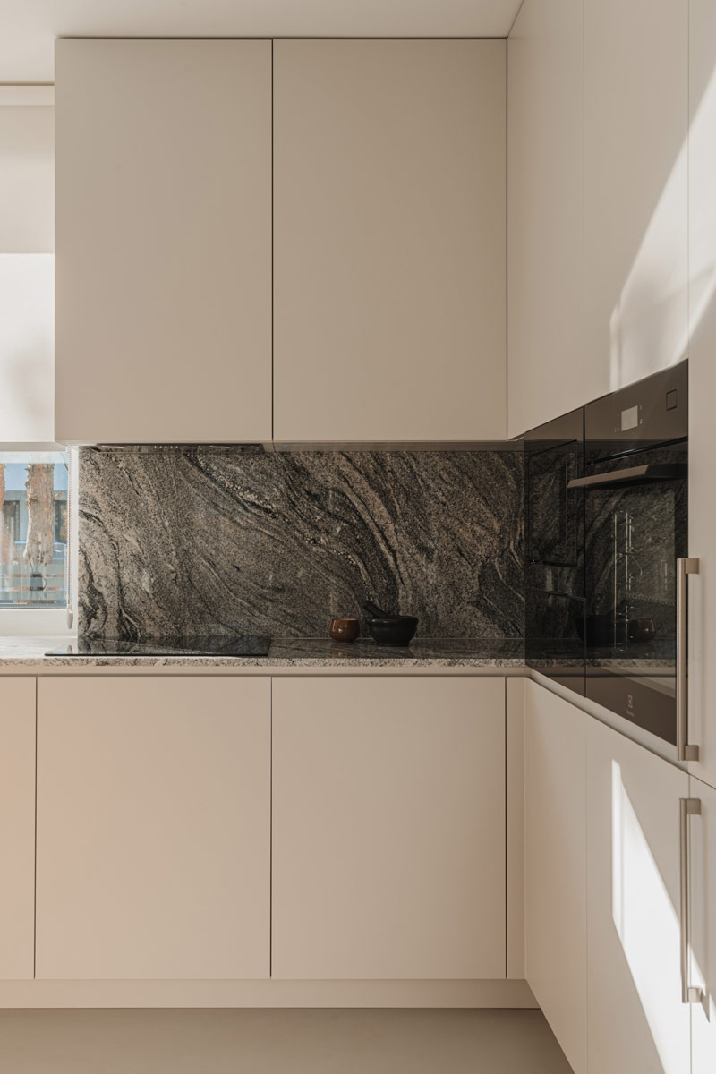 Już w założeniach projektowych Inwestorzy określili preferowane materiały i kolorystykę wnętrz. Baza projektu jest ponadczasowa tak aby była odporna na naturę przemijania. Posadzka z mikrobetonu w ciepłym szaro-beżowym odcieniu uzupełniona została o elementy z naturalnego jasnego dębu. Dopełnieniem są beże, szarości, biele, a także kamień granitowy, który tworzy widoczny naturalny detal. Kontrastem natomiast są elementy z czarnego drewna oraz odważne plamy kolorystyczne pojawiające się w projekcie. Całości dopełniają dekoracje okienne z ponadczasowymi upięciami. Na firany wykorzystano tkaninę o lnianym splocie w jasno beżowym wybarwieniu.