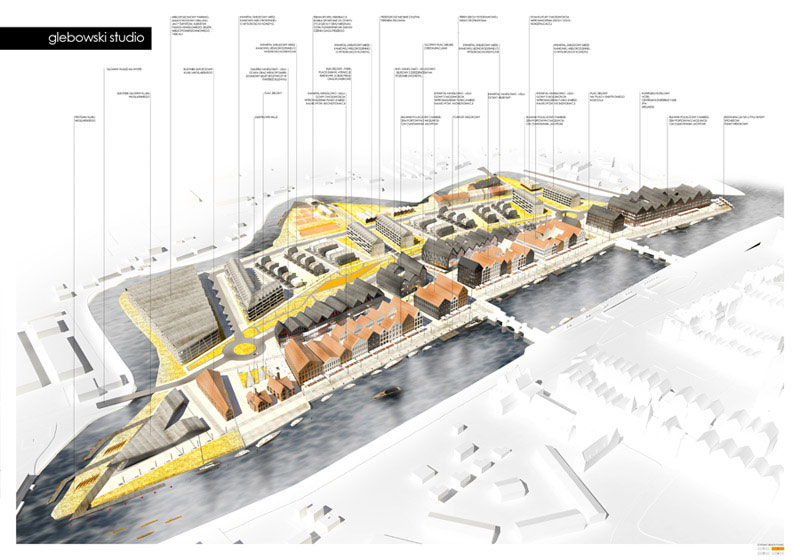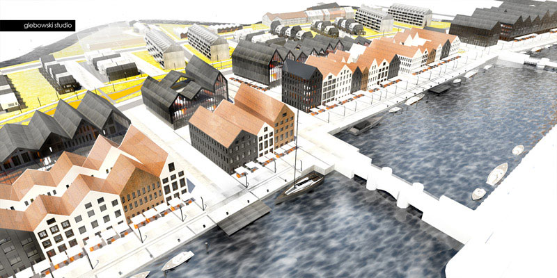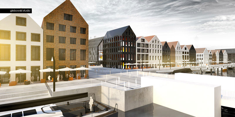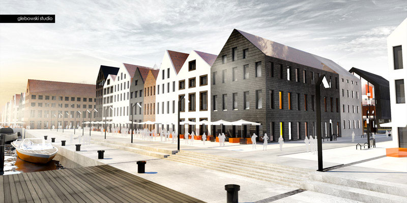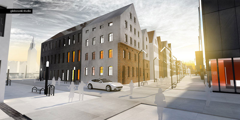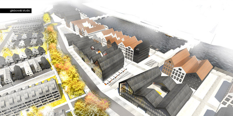 1.1. Rozwinięciem pierwszego założenia jest zjawisko wcześniej już wspomnianej symbiozy, którą wspomaga płynna komunikacja między brzegami rzeki oraz niezwykle cenna ciągłość architektoniczna. Tworzące ją budynki zachowują nie tylko funkcje zabudowy historycznej, ale także nawiązują swym kształtem do spichlerzy, zgodnie z zaleceniami konserwatorskimi. Kontynuując, zwarta zabudowa tworząca zagęszczone, lecz nieintensywne wnętrza urbanistyczne, daje miastu najbliższe i najdogodniejsze zaplecze handlowe i mieszkalne, edukacyjno – kulturalne, a bezpośrednie sąsiedztwo centrum jest prestiżowym i ergonomicznym punktem lokalizacyjnym dla zadanych przez projektanta funkcji społecznych na wyspie. Pożądane wrażenia potęguje precyzyjny dobór proporcji w gabarytach poszczególnych elementów składowych, odtwarzających historyczny, śródmiejski charakter, wspólnie tworzący unikatową, przyjazną przestrzeń miejską. Wzajemne oddziaływanie, idealne uzupełnianie się zadanych funkcji, tworzy atmosferę łączności, pożądanej synchronizacji i bliskiej przynależności z centrum miasta, wykluczając jednocześnie zjawisko konkurencji lub zbędnej powtarzalności.